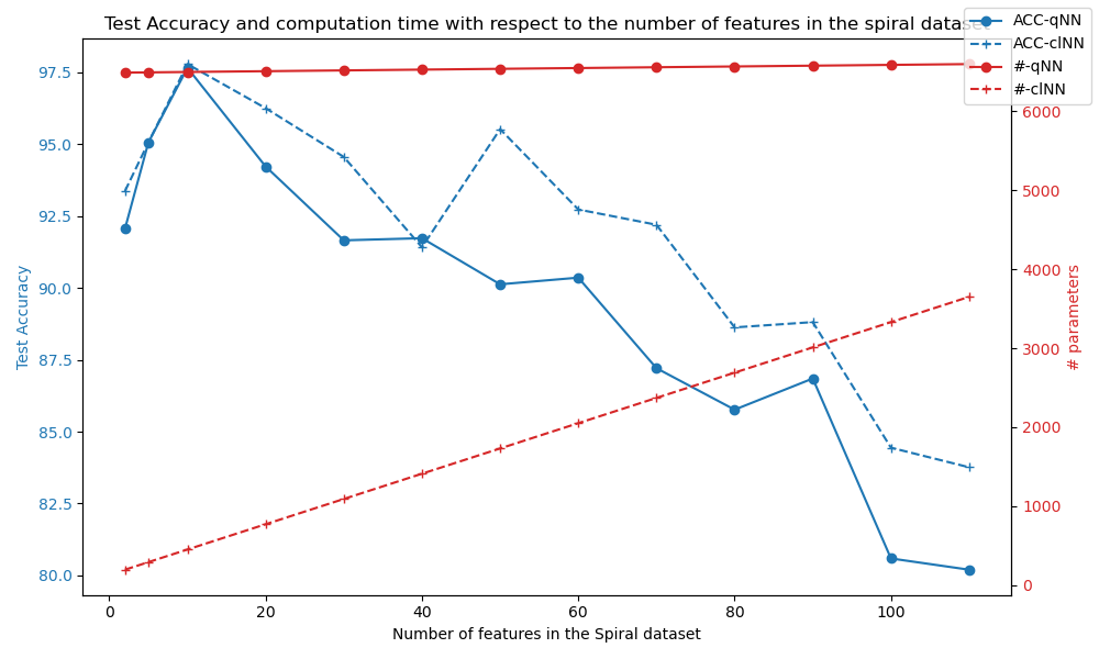 Recreated the progressive-complexity spiral dataset protocol (10 to 110 features).